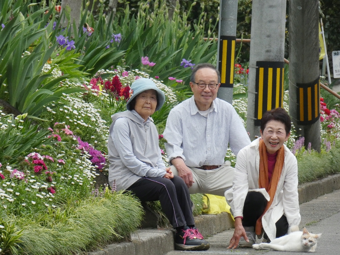 大分市椿が丘の公園で春の草花が見頃住民が荒廃した園地を花...