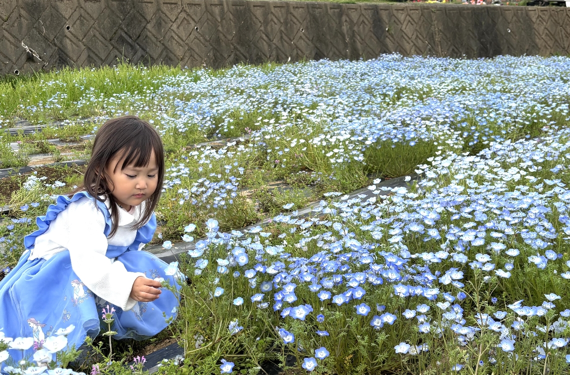 大分市おかばる花公園でネモフィラまつり開催青い花を川に見...
