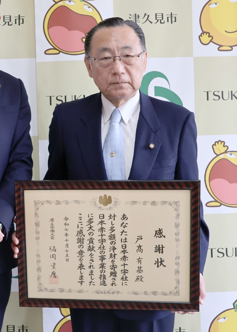 津久見市の戸高さんに厚労大臣感謝状日本赤十字社に高額寄付