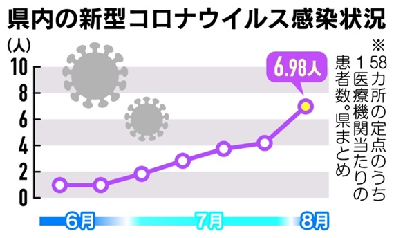 県内で新型コロナウイルスの感染がはやり始めている。県によると、県内58の定点医療機関による報告数は6月下旬から増加が続いている。...