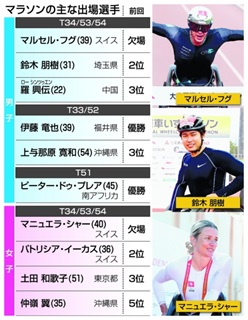 昨年、初出場で大会を制したヒロインが圧倒的な実力を示し、2連覇を成し遂げた。 マラソンT34/53/54女子のカテリーヌ・デブルナー(29)=スイス=は、序盤から抜け出すと前半は世界記録を上回るペースで快走した。ところがハーフ地点を過...