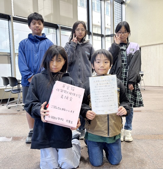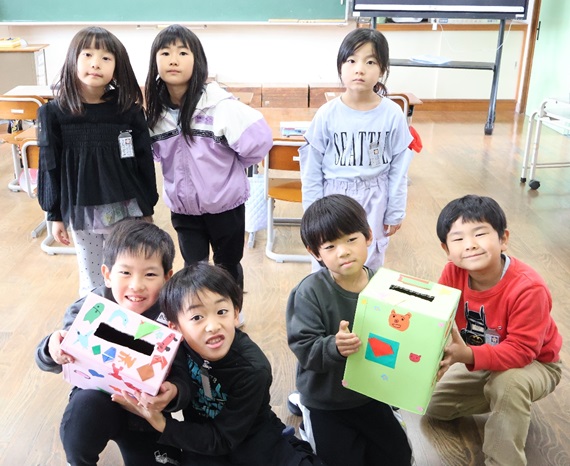 佐賀関小の児童が、義援金受け付けの募金箱を作った。...