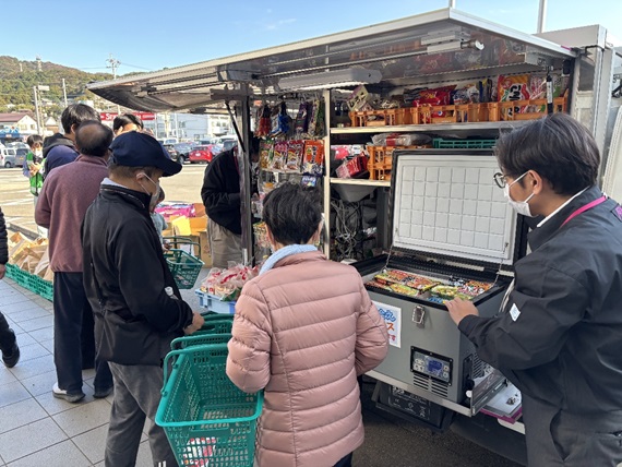 大分市佐賀関で発生した大規模火災を受けて、イオン九州(福岡市)は7日、避難所となっている佐賀関市民センターや漁協近くで避難者向けの移動販売を始めた。...