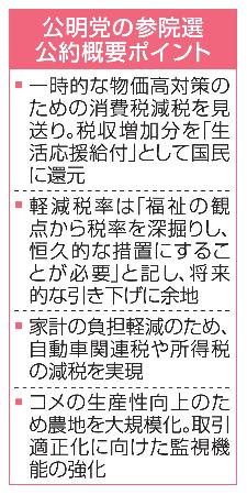 公明党の参院選公約第2弾の概要が判明した。当面の物価高対策として当初検討した、食料品などに適用される消費税の軽減税率引き下げは見送る一方、税収増加分を国民に還元する「生活応援給付」を盛り込む。関係者が5日明らかにした。...