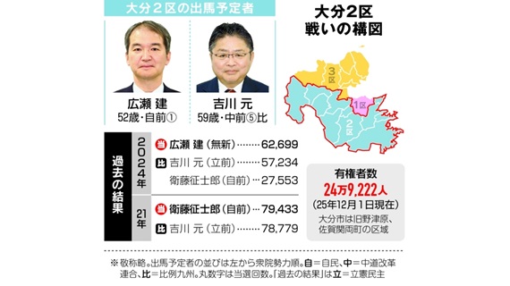 衆院選大分2区は自民党前職の広瀬建氏(52)と、新党・中道改革連合の吉川元(はじめ)氏(59)=比例前職=による一騎打ちの見通し。2024年の前回選挙は保守分裂の中で広瀬氏が制した。今回は自民から離れた公明党が立憲民主党出身の吉川氏を支え...