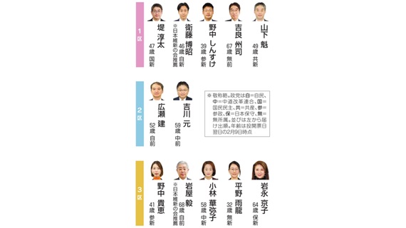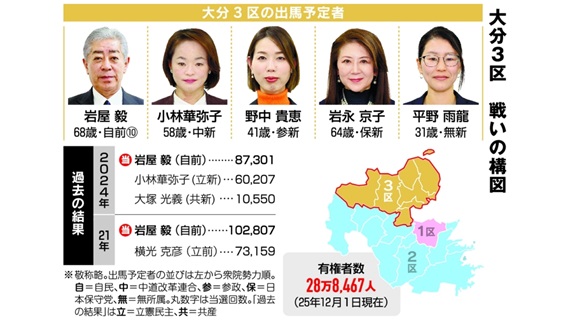 第51回衆院選は27日公示される。真冬の政治決戦となり、2月8日に投開票を迎える。2月投開票は1990年以来。衆院選は2024年10月以来で、約1年3カ月ぶり。大分県内の3選挙区には26日時点で前職、新人の計12人が立候補を表明している。...