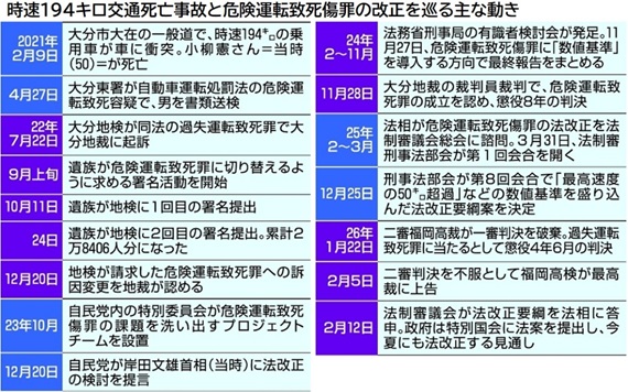 大分市の時速194キロ交通死亡事故で適用要件の不明確さが浮き彫りになった危険運転致死傷罪について、法務省は9日、スピード違反や飲酒運転の「数値基準」を盛り込んだ改正試案を法制審議会(法相の諮問機関)の刑事法部会に示した。一般道は最高速度を...