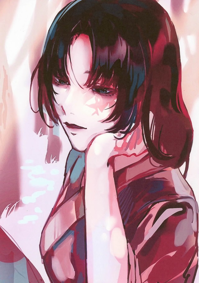 誾千代の死を追悼する二人を描いた。二人を見下ろしているのは誾千代。真っ白な毛引縅を身に着けている。彼女の後ろの光背は荼枳尼天のもの。統虎は彼女を見続けている。真っ白な着物は死装束のようにも見えるようにした。彼の左手から伸びる糸で遊んでいるのはミケです。