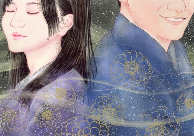 誾と統虎は男と女としては愛し合えず、想いの形は違っており、普通の夫婦として交わることができないので遠い存在かもしれない。しかし、長年かけてふたりの間に生まれた絆は今、強く結ばれており、普通の夫婦ではないふたりだけの関係性を描きたいと思って制作した。服の模様のように散らして描いている花は「百日草」。「絆」「不在の友を思う」という花言葉がある。たとえ戦で傍らにいなくとも、互いに想い合っているふたりにぴったりだと思う。ふたりの表情や背景、服の色味でも心情を表現した。