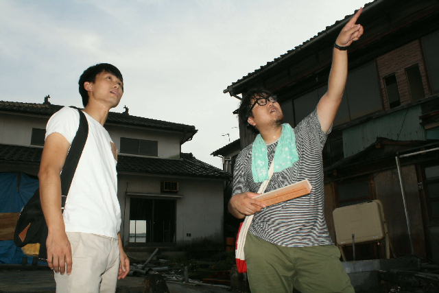 リノベーションに魅せられた。広場予定地に立って打ち合わせをする河野功寛さん(左)と先輩の東郷哲史さん=佐伯市船頭町