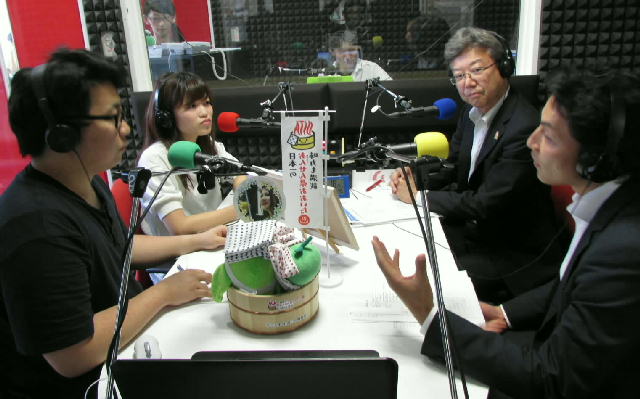 大学生は、大分県が毎週木曜日夕方に提供する「わくわく!天神かぼす風呂」のパーソナリティーだ。この日は国東市出身でKアライアンス・ジャパン社長の岡崇史さん(40)をゲストに招いた。「文殊仙寺の護摩たきや建て干し網漁など、国東では面白い体験ができる」と岡さん。井上楓さん=九州大学、大分市出身=は「ゲストの古里への思いを聞くと、大分の魅力を発見できます」と話す。岡さんは福岡大分県人会青年部で活動しているという。一野拓己さん=九州産業大学、別府市出身=は「いつか大分にとも思うが、まだ分かりません。青年部は学生もOK。参加していろいろ勉強したい」と話した。