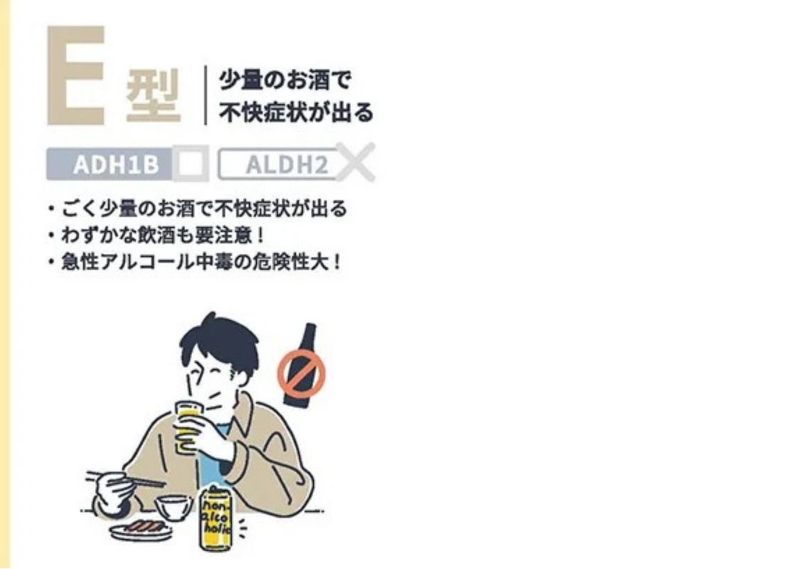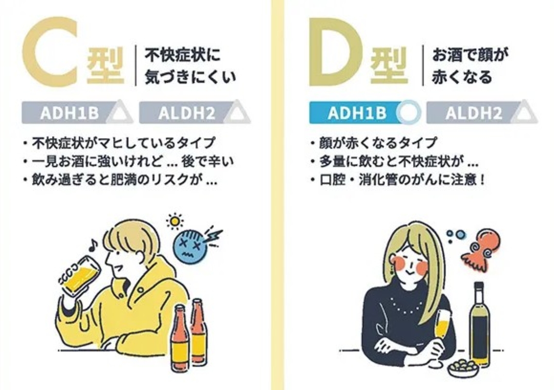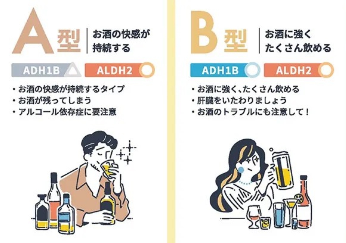 この二つの酵素の働きが強いか、弱いかでアルコール体質が分けられます。