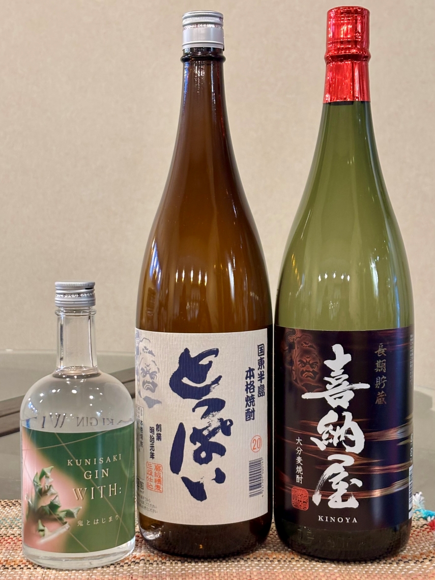 左からクラフトジンの「WITH: 鬼とはじまり」、本格麦焼酎「とっぱい」、本格麦焼酎「喜納屋」