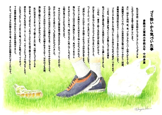 私は小学二年生の時からプロギングというジョギングをしながらゴミを拾う活動をしています。月に一回から四回、母、弟、プロギングのメンバーの四人から十人で未就園児から六十代くらいの老若男女が朝六時三十分から二時間、美観地区周辺の約五キロメートル...