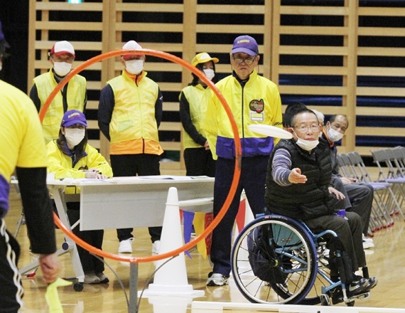 第29回県ふれあい大会は14日、大分市のクラサス武道スポーツセンターであった。円形のゴールに通したディスクの数を競うアキュラシー種目があり、県内の10施設・団体から約100人が出場。...