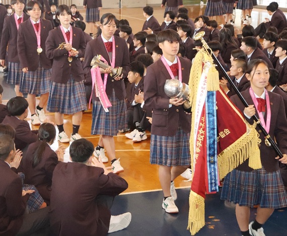 第34回全日本高校女子サッカー選手権で県勢初の日本一に輝いた柳ケ浦高女子サッカー部の優勝報告会が13日、宇佐市の同校であった。...