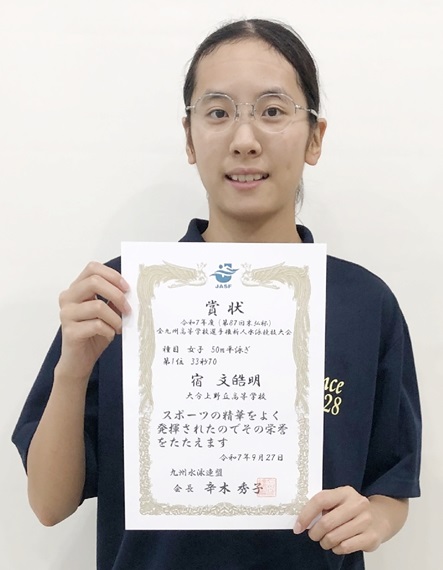 九州高校新人大会の競泳は27日、福岡市総合西市民プールであった。女子50メートル平泳ぎで、宿文皓明(上野丘)が優勝した。...