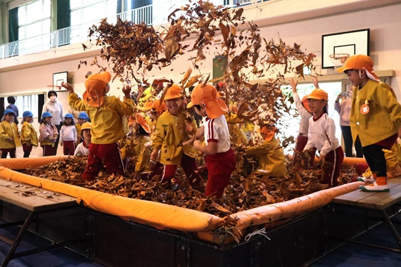 落ち葉敷き詰めた「プール」を楽しむ 杵築市豊洋小で自然体験活動