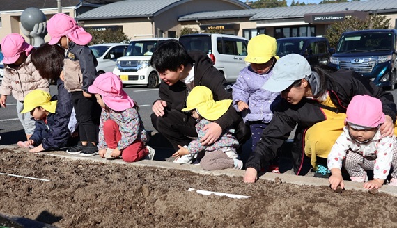 杵築市の介護施設でチューリップの球根植え付け 園児を招き職員と一緒に作業