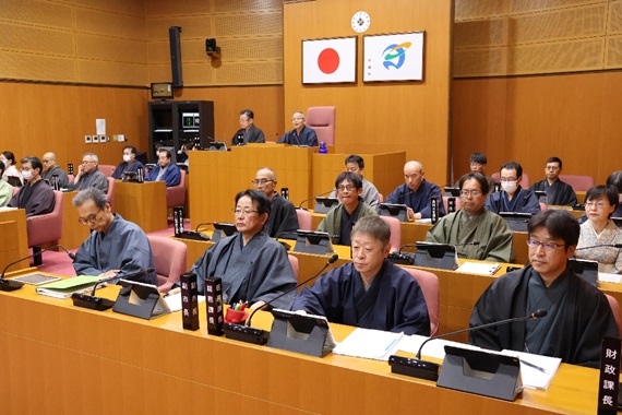 杵築市議会、和服姿で開会 「着物の似合う町」をPR
