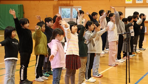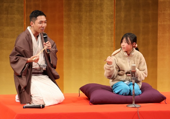 九重町の小中学生が寄席文化体験 地元出身落語家が高座、児童がうどんすするしぐさに挑戦