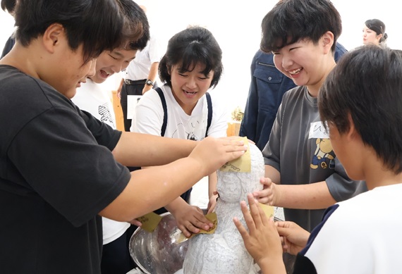 国東小で文化財ワークショップ 桜八幡神社の三神像レプリカを磨く