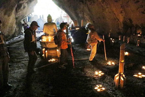 「かまどケ岩」に揺らぐ竹灯籠の明かり 玖珠町で秋祭り、古後神楽の奉納も