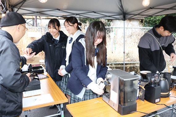 玖珠美山高の生徒が豊後森駅前で「1日限定カフェ」 列車待つ人たちに入れたてのコーヒーなど提供