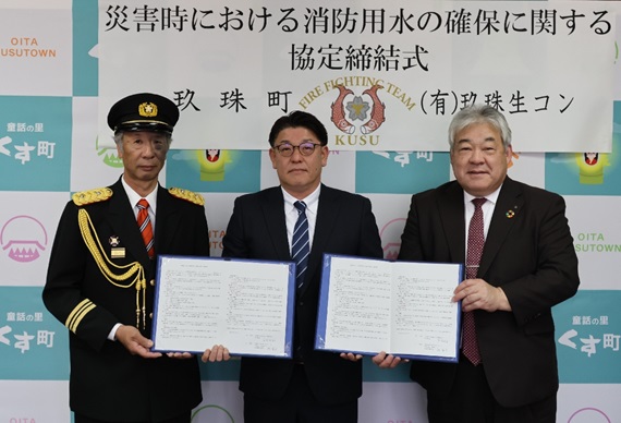 玖珠町と玖珠生コンが消防用水供給で協定 ミキサー車で水搬送、林野火災の早期消火に期待