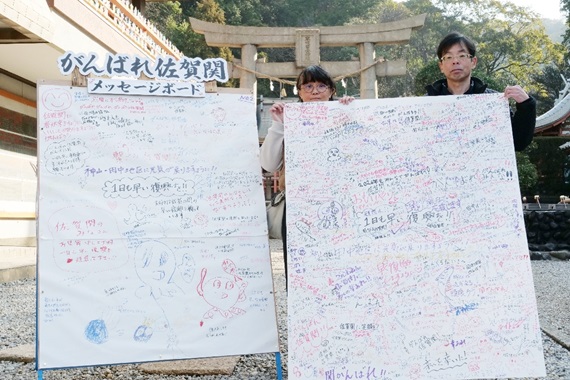 「がんばれ佐賀関」大火被災者へのエールびっしり 早吸日女神社のメッセージボード、2枚目に