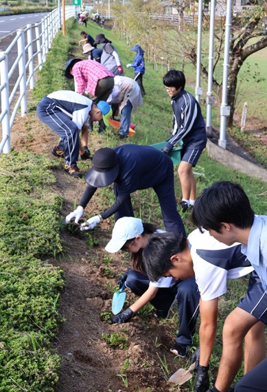 佐伯市本匠中の生徒らがシバザクラ植える 地域住民と協力、県道沿いの傾斜地に