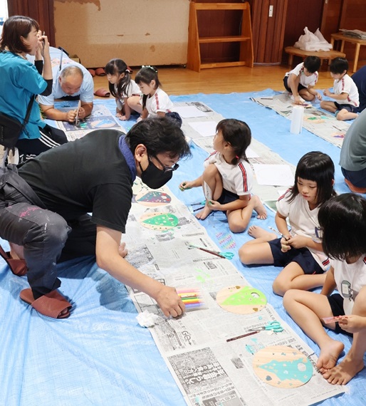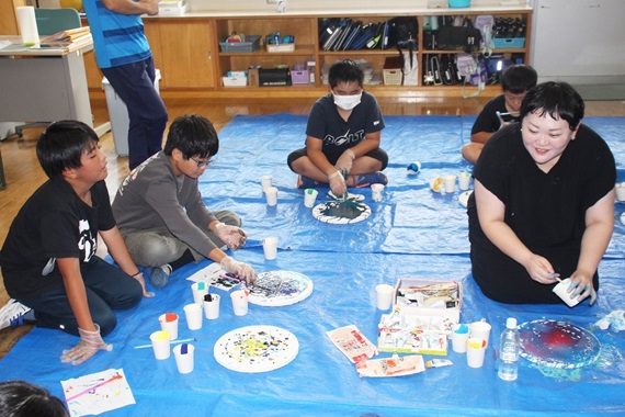 佐伯市松浦小で児童とアーティストの交流授業 「フルイドアート」に挑戦