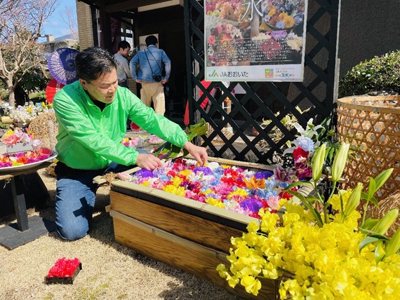 佐伯産スイートピーなど3千本、華やか鮮やか「花手水」 市城下町観光交流館で3日まで