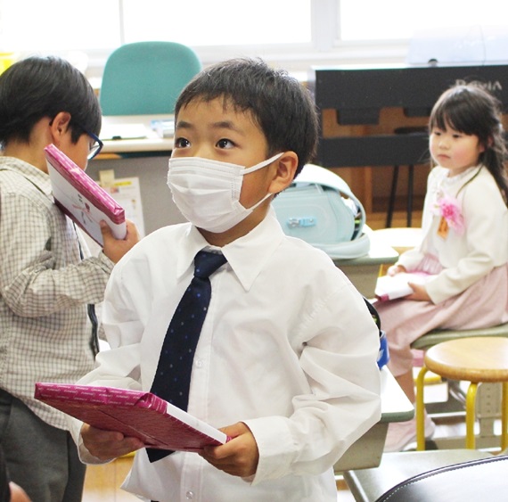 佐伯市あまべ商工会青年部が市内の新1年生に色鉛筆贈る