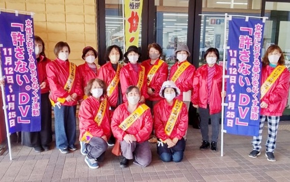 津久見市でDVや性暴力の撲滅を訴える街頭活動 啓発用のティッシュやパンフレット配布