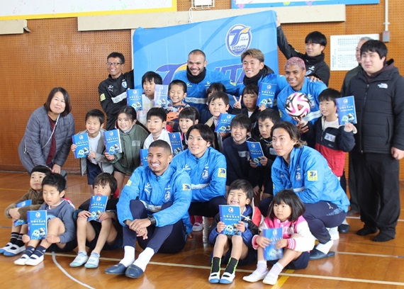 津久見市堅徳小でトリニータ選手のサッカー教室 ドリブル練習やミニゲームで盛り上がる