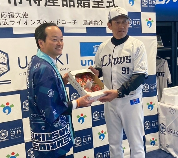 臼杵市がライオンズの鳥越コーチに特産品贈る 「食べて疲れを取って、おいしさ広めて」