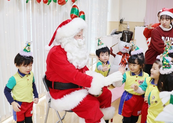サンタクロースが由布市のこども園訪問 記念撮影やタッチ、園児「お話できて楽しかった」