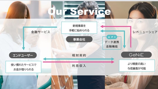 また、事業会社にとっては、API接続だけで金融事業に参入することができ、レベニューシェアにより新たな収益源を得ることも可能になります。金融業務は全てGeNiEが担うため、特別なライセンスや金融事業に関する知見は必要ありません。