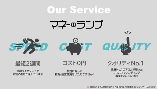 マネーのランプは、業界トップのアコムグループのデータ・ノウハウ・知見を活かし、最短2週間の導入スピード、コスト0円、高いサービス品質を実現したサービスです。