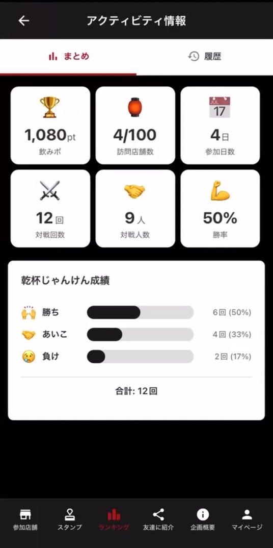 訪問店舗数や勝率、乾杯じゃんけん回数などを数値で可視化できるアクティビティ情報画面