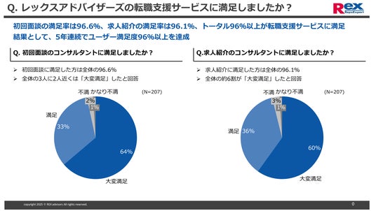 96%以上の回答者が「初回面談のコンサルタントに満足」「求人紹介のコンサルタントに満足」と回答しており、昨年に引き続きサービス利用満足度96%以上となりました。