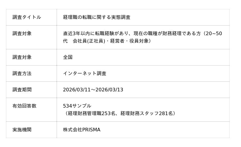 https://www.career-adv.jp/)では、「経理管理職の転職実態に関する調査」を行い、2023年から2026年に経理管理職に転職した253名の有効サンプルを集計しました。本調査は2026年3月に実施した経理財務職に関する調査(