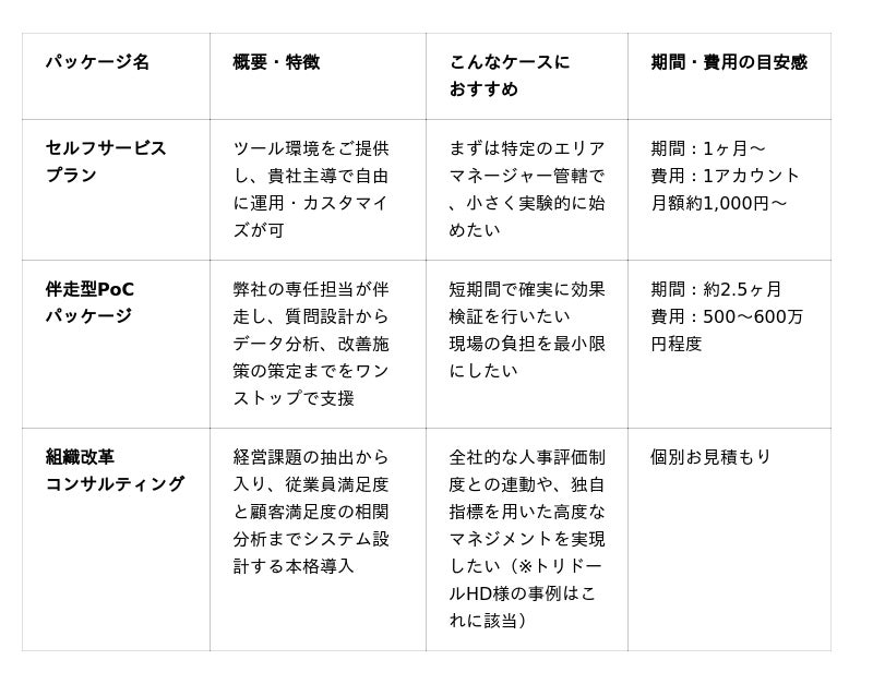 アルサーガパートナーズはこれまで、これらの課題を解決する「面談AI」を個別提供してまいりました。しかし、企業ごとに抱える課題の深さや、システム導入にかけられるリソース、実行したい施策のフェーズは様々です。「まずは小さく始めたい」「データ分析から施策まで伴走してほしい」といった多様なニーズに迅速にお応えするため、この度、3つの導入プランとしてパッケージ化いたしました。