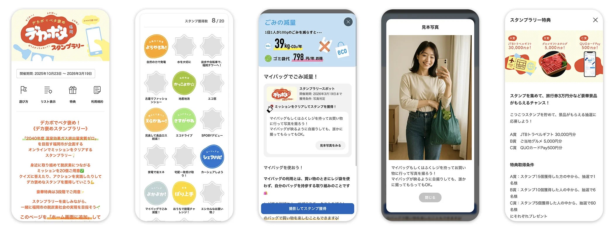 たとえばマイバッグで買い物した写真アップなど、エコな買い物実践でスタンプが獲得できる