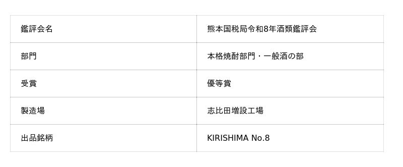 霧島酒造株式会社(本社:宮崎県都城市、代表取締役社長:江夏邦威)の志比田増設工場は、熊本国税局令和8年酒類鑑評会 本格焼酎部門・一般酒の部において優等賞を受賞し、対象の4県(宮崎・鹿児島・熊本・大分)から各1蔵のみが選ばれる「優等賞製造場代表」にも選出されました。