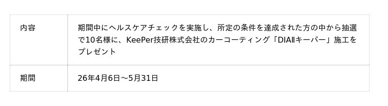 本機能のリリースに合わせて、「KINTO Unlimitedアプリ」にてヘルスケアチェックをご利用いただいたお客様を対象としたプレゼントキャンペーンを実施いたします。