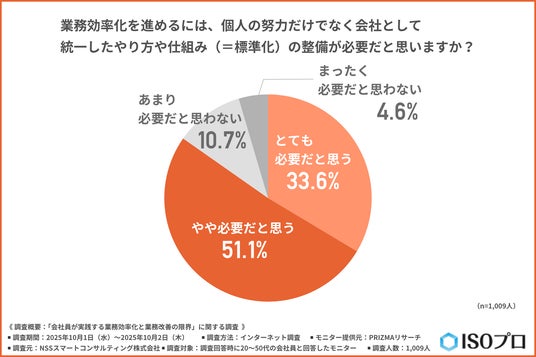 「業務効率化を進めるには、個人の努力だけでなく会社として統一したやり方や仕組み(=標準化)の整備が必要だと思うか」について尋ねたところ、約8割が