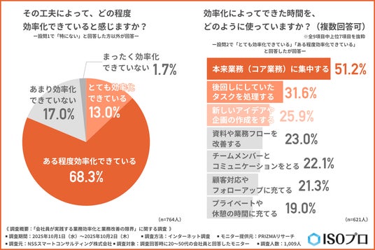 効率化によって捻出された時間は「本来業務への集中」「後回しにしていたタスク処理」「新しい企画作成」など生産性向上につながる業務に活用されており、効率化についての個人の努力の有効性が示されました。