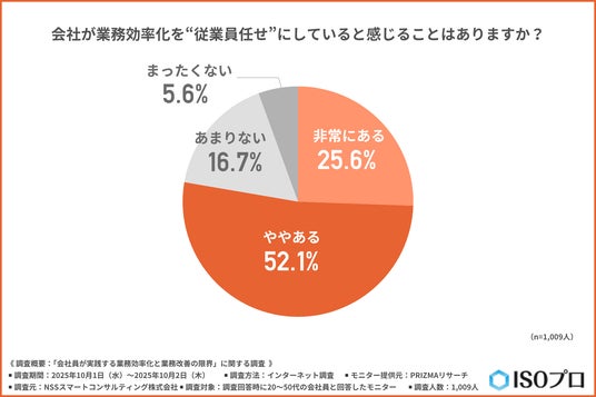 「会社が業務効率化を“従業員任せ”にしていると感じることはあるか」と尋ねたところ、約8割が